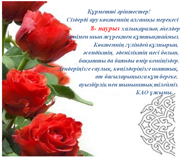 8 НАУРЫЗ ХАЛЫҚАРАЛЫҚ ӘЙЕЛДЕР КҮНІ МЕЙРАМЫМЕН ШЫН ЖҮРЕКТЕН ҚҰТТЫҚТАЙМЫЗ.