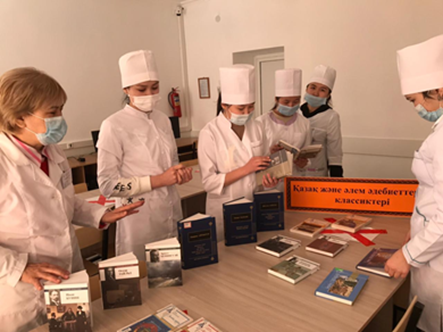 «2021 жыл- Қазақстандағы балалар  мен жасөспірімдердің кітап оқуын қолдау жылы» деп жариялануына байланысты,жоспар бойыншаосы жылдың 8 сәуір күні  ОҚМА колледж оқу залында «Қазақ және әлем әдебиеттерінің классиктері»тақырыбына кітап көрмесі ұйымдастырылды.    Көрмеге медицина колледжі директорының тәрбие ісі жөніндегі орынбасары М. А. Тайжанова, Жалпы білім беретін пәндер кафедрасының меңгерушісі А.Т.Сатаев, кафедра оқытушылары,кітапханашы Е.А. Қуанышбекова және колледж студенттері қатысты. Көрменің мақсаты: – жастарымызды ерлік пен батырлыққа, патриотизмге шақыратын, рухты көтеретін, өмірге құштарлықты насихаттайтын кітаптардың  оқылуына  ықпал  жасау.