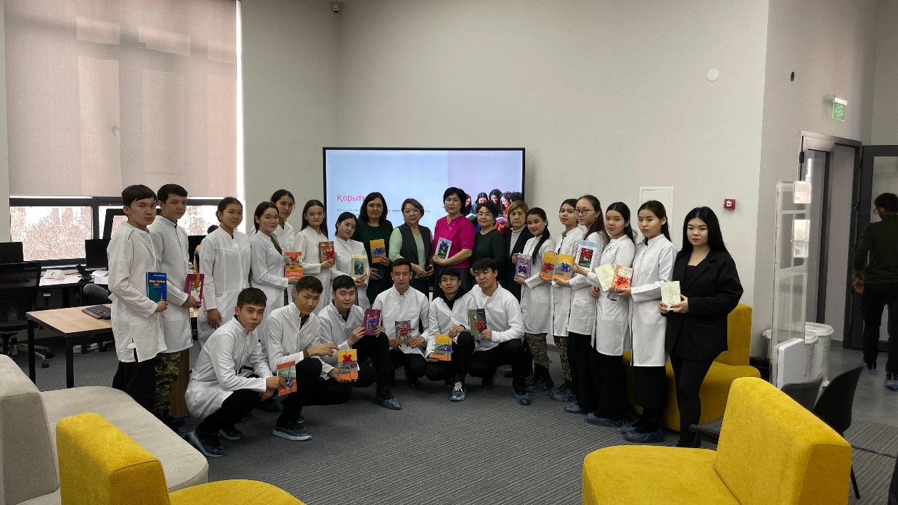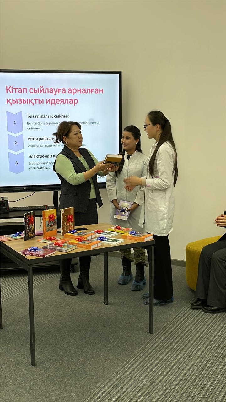 14 ақпан – Халықаралық кітап сыйлау күні, бұл кітап оқуды сүйетін және ұнататындардың мерекесі. Әдетте бұл күні бір-бірімен кітап алмасады немесе бір-біріне сыйға тартады. Жаңа, қызықты, танымдық кітап оқу – кез келген адам үшін үлкен қуаныш және кітап әрқашанда ең керемет сыйлық болып қала береді. Осы мереке қарсаңында, 2025 жылдың 10 ақпан күні ОҚМА АҚ медицина колледжінің жалпы білім беретін пәндер кафедрасының  оқытушылары – Ж.С.Сарымсакова, А.А.Исабекова және кітапханалық-ақпараттық орталығының қызметкерлері  бірлесе отырып, білім алушылар арасында бір-біріне өздерінің оқыған кітаптарын насихаттап, «Досыңа кітап сыйла» атты челленджін өткізді. Бұл акцияның  басты мақсаты — кітаптың құдіретін арттырып, оқуға деген сүйіспеншілікті ояту, кітап оқуға шақыру, білім алушылардың кітап оқуы мен кітапты бір-біріне сыйлау дәстүрін қайта жандандыруға ықпал ету, кітапханаларға жақсы кітаптар тарату, технология заманында да кітап өз құндылығын жоғалтпайтын ерекше сыйлық болып қалатынын көрсету. Челлендж аясында қазақ халқының ұлы ақын жазушыларының кітаптары, даналық ой пікірлері талқыланып, кітаптың адам өміріндегі ролі, білім мен мәдениеттің қайнар көзі екендігі жөнінде сөз қозғады. Білім алушылар сүйікті шығармалары туралы айтып, оқыған кітаптары жайында өз әсерлерімен бөлісіп, бір-біріне кітап сыйлады. Кітапханалық ақпараттық орталығының басшысы Дарбичева Раушан Искаковна мен  колледж оқу залының кітапханашысы Куанышбекова Еркежан Азимхановна сөз сөйлеп, барлықбілім алушаларға алғысын білдіріп, достар арасындағы сыйластықтың көрінісі ретінде кітап сыйлау үрдісін қалыптастыру керектігін айтып, әдеби шығармалар, өлеңдер жиынтығын сыйлады. Кітап жақсы дос, рухани азық. Сондықтан да бір-бірімізге сүйіспеншілікпен кітаптар сыйлайық!