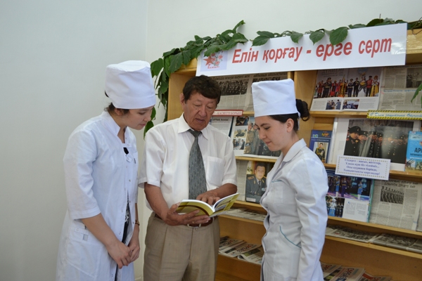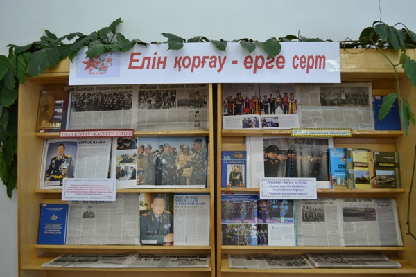 С 22 апреля по 05 мая 2015 года в 1-ом читальном зале Библиотечно-информационного центра ЮКГФА экспонировалось книжная выставка, посвященная  Дню защитника Отечества «Елін қорғау — ерге серт». На выставке были представлены 45 книг и статьи из периодических изданий.