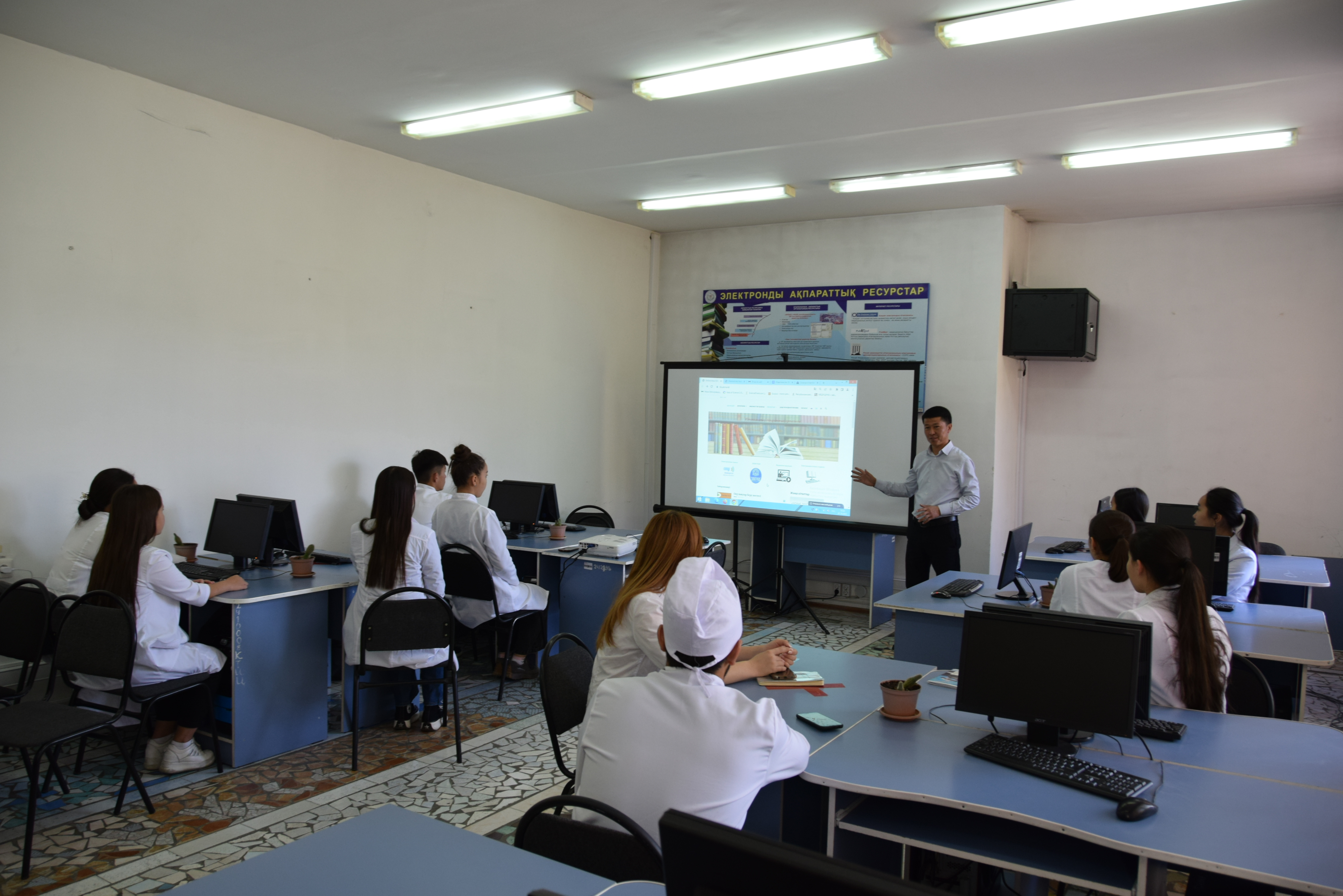 Студентам были показаны различные методы поиска информации, подробно освещен ход работы с электронным каталогом библиотеки и всеми полнотекстовыми базами данных из библиотечного фонда («РМЭБ», «Эпиграф», «Акнурпрес», «Параграф Медицина», «Электронные полки студента» и др.).